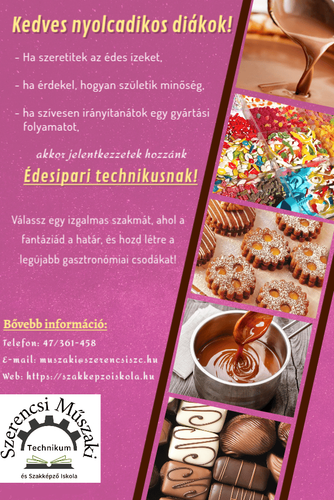Iskolánkban november 6-án tartottuk a nyílt napot. A programot Nagyné Sztankovics Nikolett igazgató asszony nyitotta meg, aki köszöntötte a vendégeket, majd ismertette a képzési kínálatunkat. Ezt követően Dr. Takács István tartott előadást a szerencsi csokoládékészítés múltjáról, jelenéről és jövőjéről. Ekker Róbert szobrászművész inspiráló előadása után az iskola öregdiákja, Czinke Bence mutatta be eddigi életútját és szakmai munkásságát.